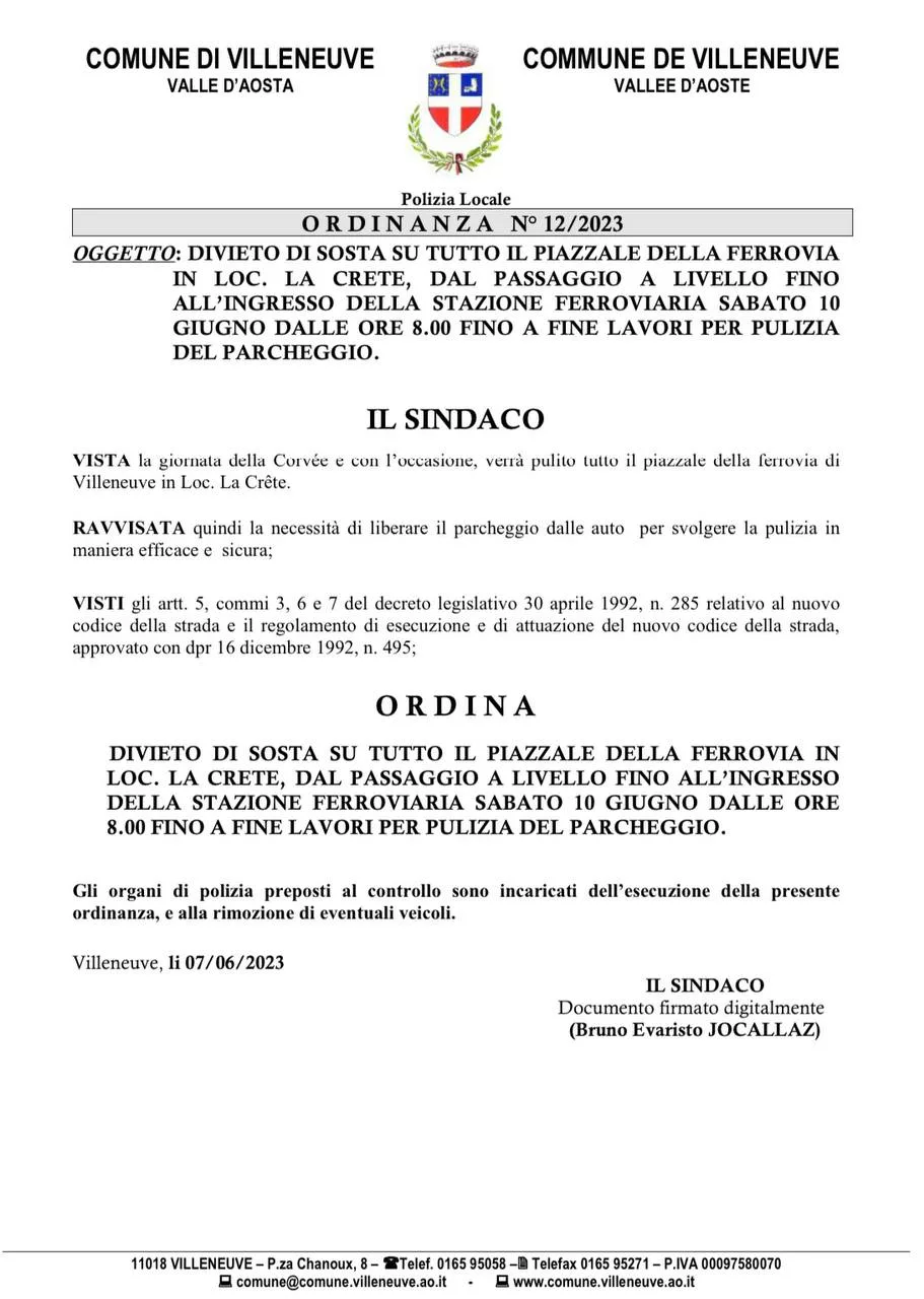 Ordinanza 12/2023 Divieto di sosta su tutto il piazzale della ferrovia a La Crête