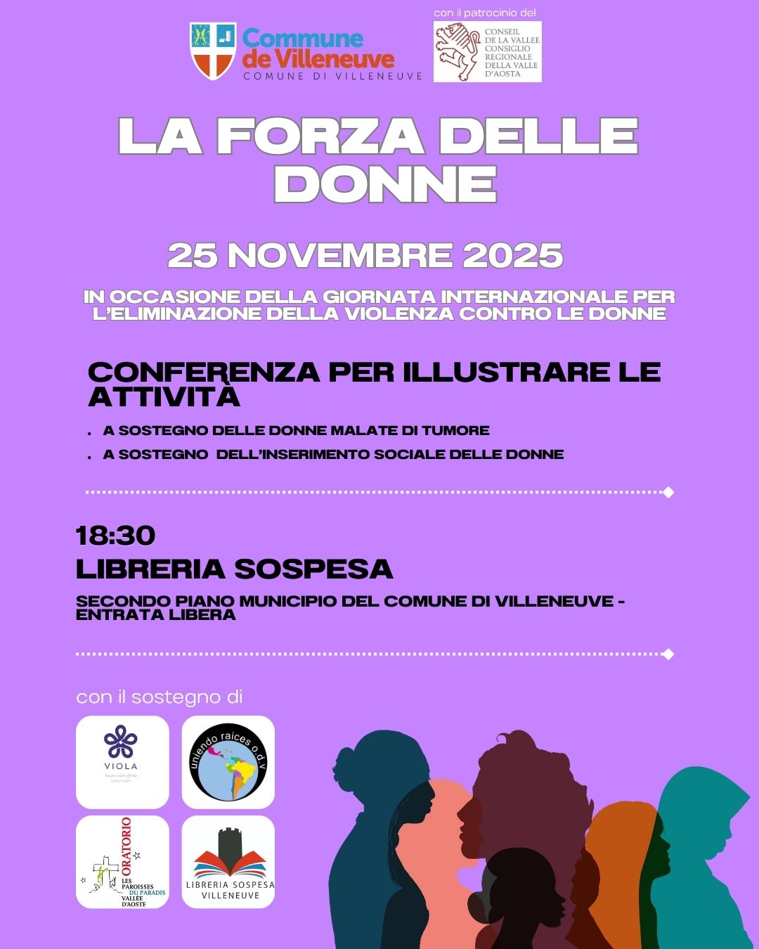 Nella Giornata Internazionale per l'eliminazione della violenza contro le Donne, il Comune di Villeneuve, con il patrocinio di Conseil de la Vallée - Consiglio Valle, in collaborazione con l'Associazione V.I.OL.A. e UNIENDO RAICES O.d.V., con il sostegno delle Paroisses du Paradis e della Libreria Sospesa, organizza l'evento - conferenza LA FORZA DELLE DONNE.
