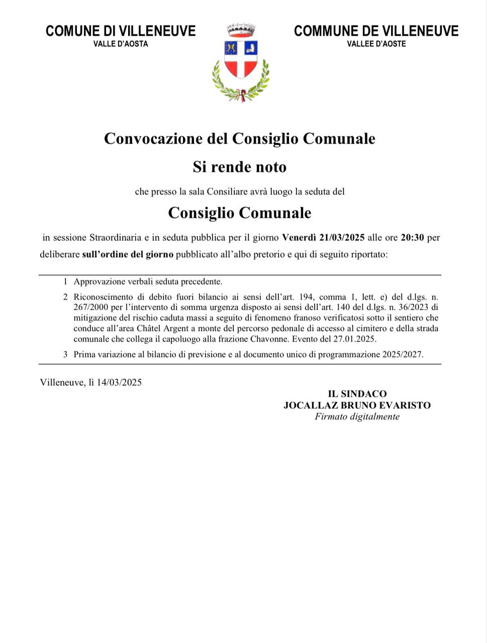 Consiglio Comunale indetto per venerdì  21 marzo 2025