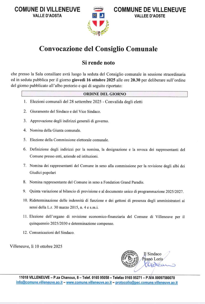 E' indetto il Consiglio Comunale in sessione straordinaria e in seduta pubblica per il giorno giovedì 16 ottobre 2025 alle ore 20:30.