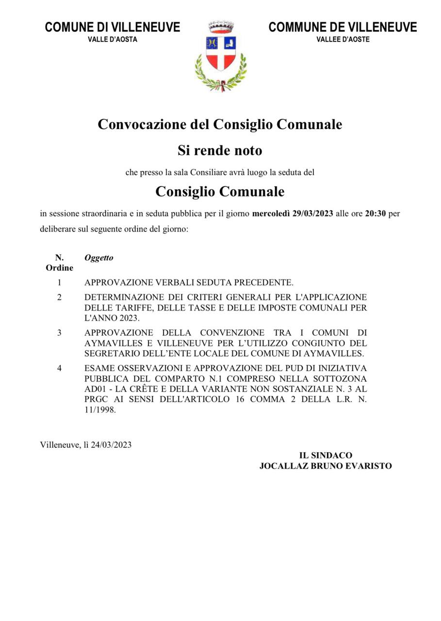 E' convocato il Consiglio Comunale in sessione straordinaria e in seduta pubblica mercoledì 29 marzo 2023 alle ore 20,30 .